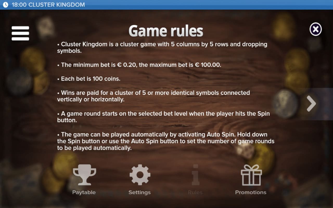 Cluster Kingdom offers dynamic gameplay with its unique cluster mechanics. Match five or more adjacent symbols to form clusters and unlock cascading wins. With each win, new symbols drop into place, offering more chances to succeed. Watch the reels light up as you score winning combinations!